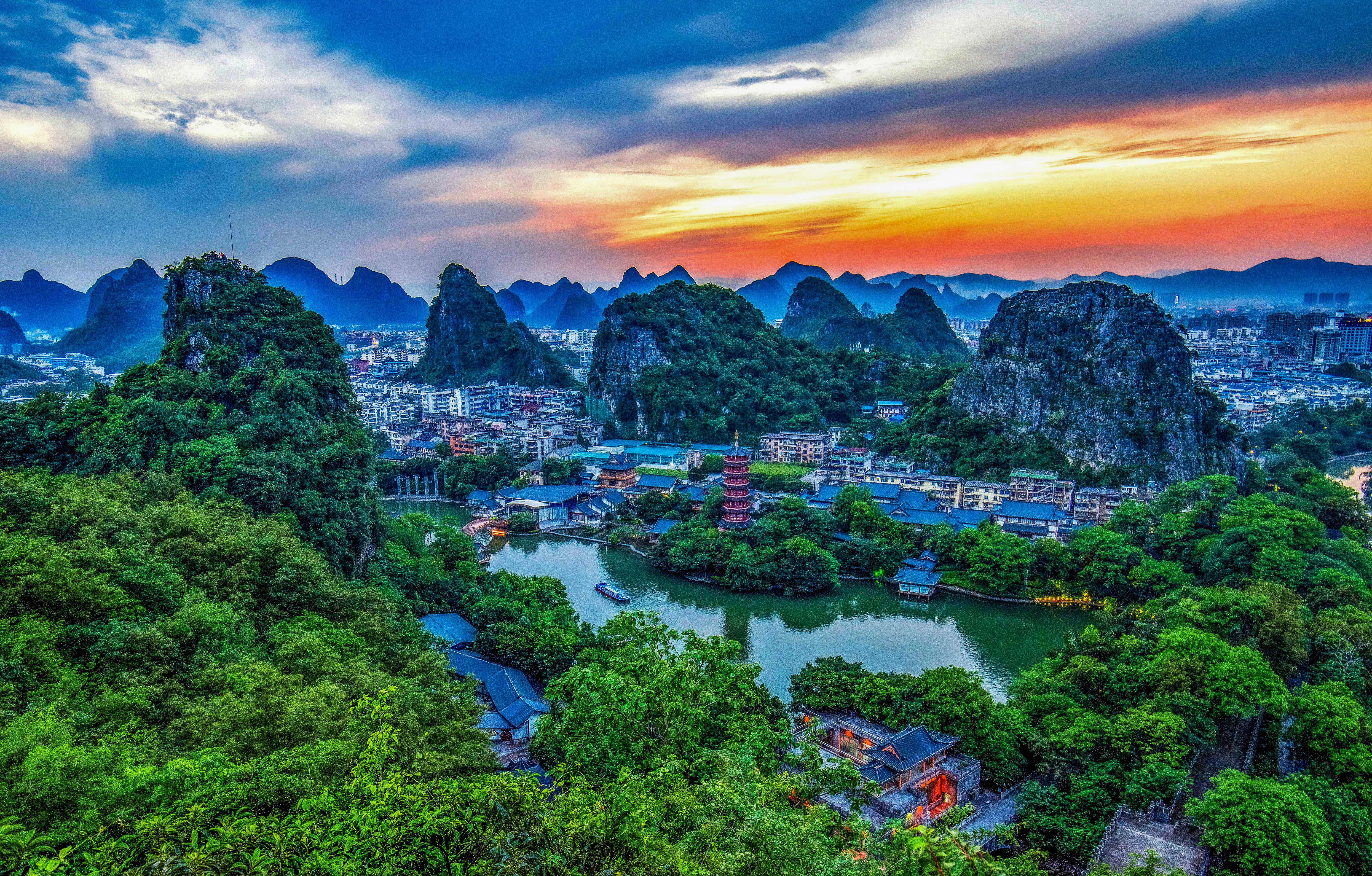 位于桂林市区北部,是“两江四湖”环城水系的重要组成部分。木龙湖以《清明上河图》中的一角为原型打造,建造了许多具有宋代建筑气息的古建筑群落,还有保存较完善的宋代古城墙。
