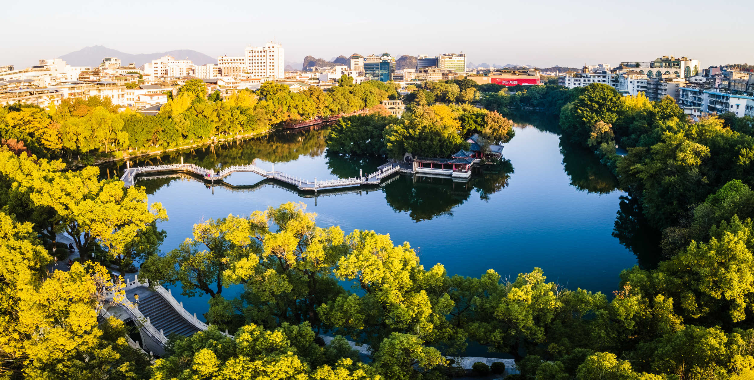 因湖畔生长了近千年的古榕树而得名。它与杉湖都是宋代人工开掘的桂林城南护城河,合称阳塘。桂林玻璃桥位于榕湖,是我国最早采用特种水晶玻璃承重体系建造的实用性桥梁。