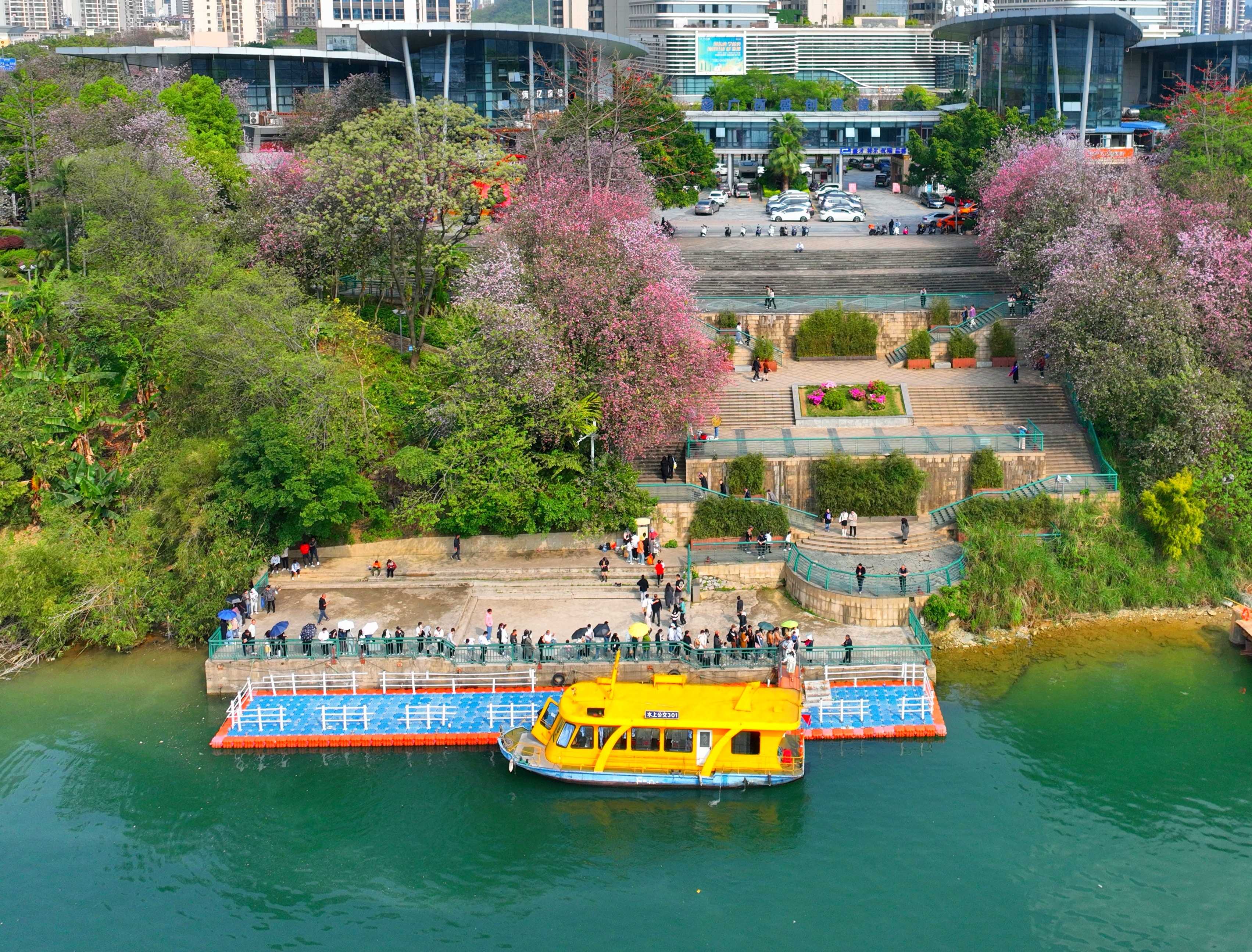 是往返柳江两岸的交通工具。乘坐橘黄色的水上公交行进在绕城的柳江上,船窗透明,沿岸窑埠古镇、蟠龙山、文庙、驾鹤山、鱼峰山等美景尽收眼底,河水在阳光的照耀下,碧绿清澈,微风轻拂,静谧而悠闲,是在白天进行柳江观光的绝佳方式。