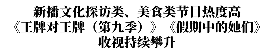 《非遗里的中国(第四季)》(CCTV-1)本月播出3期,全国累计收视1.2亿人次,全国每期平均收视率2.772%,位列本月所有频道晚间时段首播季播文艺节目收视率第一。《王牌对王牌(第九季)》(浙江卫视)新季回归,已播5期全国累计收视3244.8万人次,位列本月省级卫视晚间时段首播季播文艺节目收视率第一,最新一期浙江省收视率较首期上涨36.7%,收视热度高。《假期中的她们》(湖南卫视)本月播出4期,全国累计收视1499.2万人次,本地收视率逐期走高,累计涨幅达117.0%。《一饭封神》(上海东方卫视)9月21日收官,10期节目全国累计收视2320.9万人次,本地收视热度最高,单期最高收视率2.082%。《一站到底·少年季》(江苏卫视)本月播出4期,全国累计收视1469.9万人次,最新一期“复活赛”较首期节目上涨4.9%,关注度提升。《有点意思的院子·里院季》(浙江卫视)本月开播,已播6期累计收视1133.7万人次,浙江省每期平均收视率1.705%、收视份额12.225%,节目观看完成度达75.799%,收视粘性高。《行进中国·山海篇》(山东卫视)本月收官,10期节目累计收视2316.8万人次,山东省单期最高收视率2.101%,各期稳居同时段省级卫视节目第一。