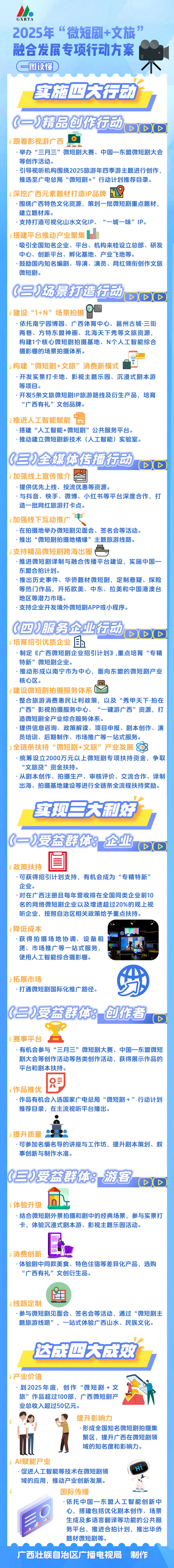 近日,老澳门六合彩开奖结果 、自治区文化和旅游厅联合印发《2025年“微短剧+文旅”融合发展专项行动方案》,通过实施开展“四大行动”,到2025年底实现创作“微短剧+文旅”作品超过100部,广西微短剧产业总收入超过50亿元,推出一批现象级微短剧作品,带动打造一批现象级景点(景区),推动“微短剧+文旅”生态全面升级。